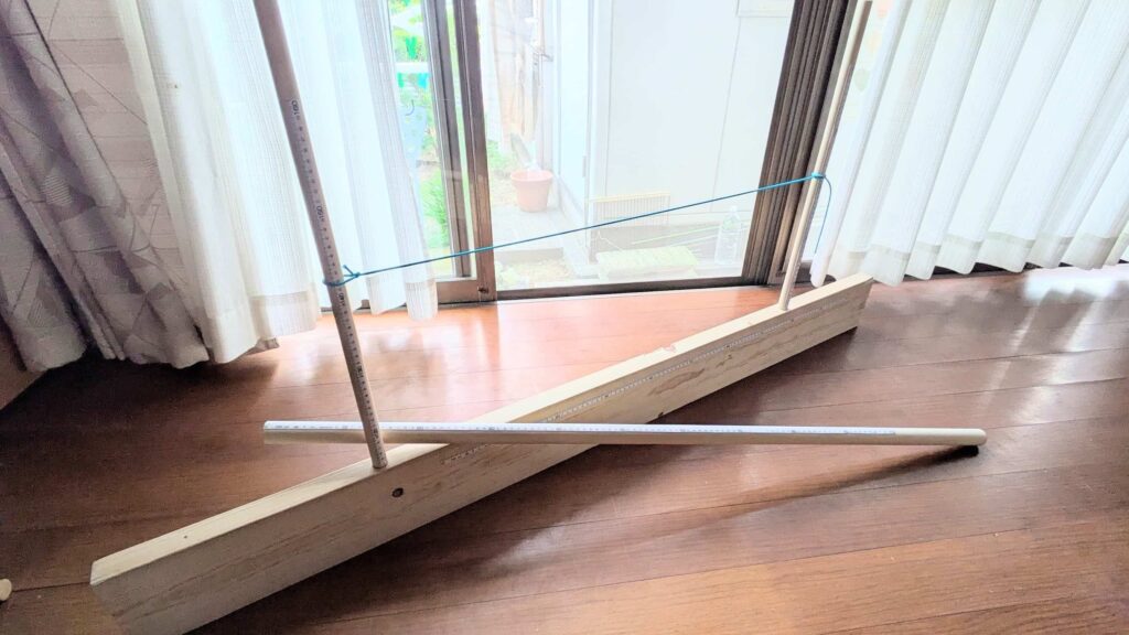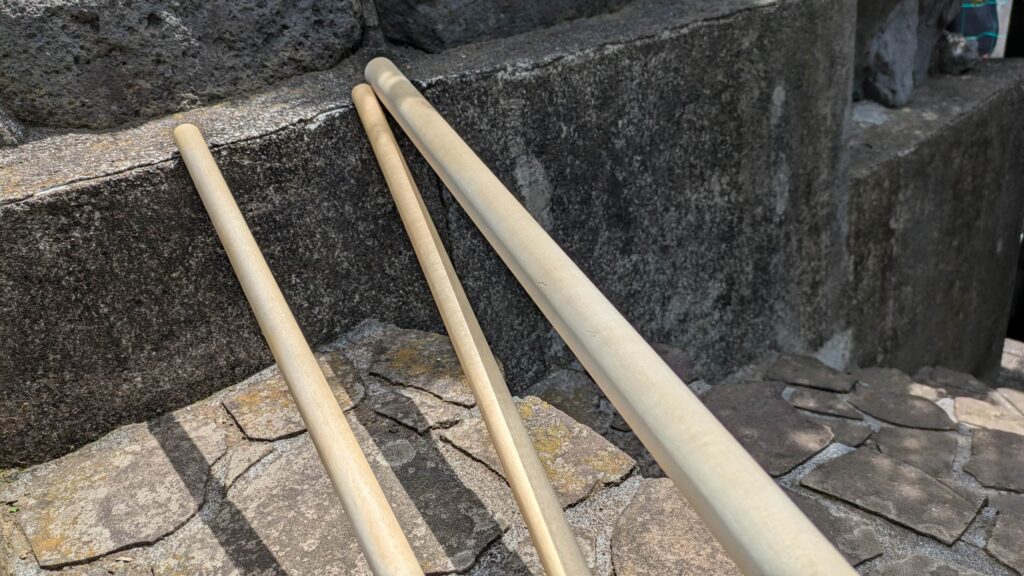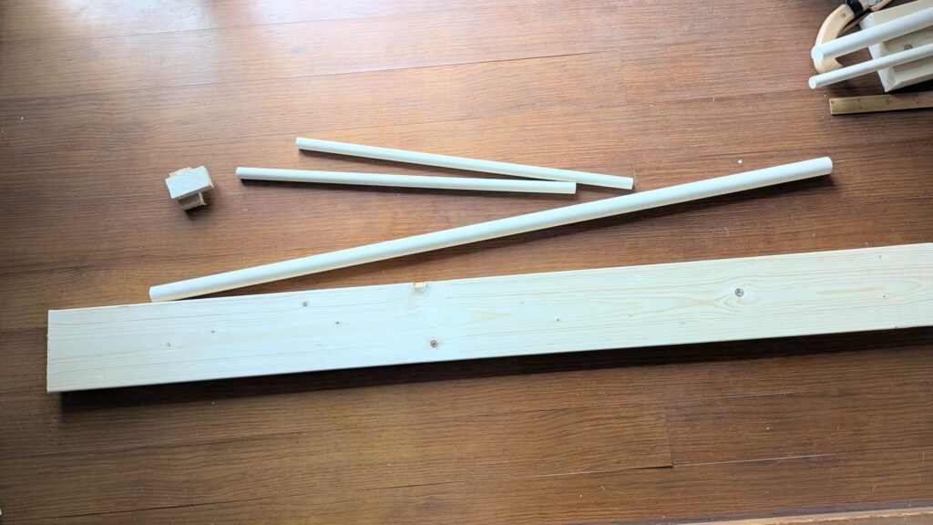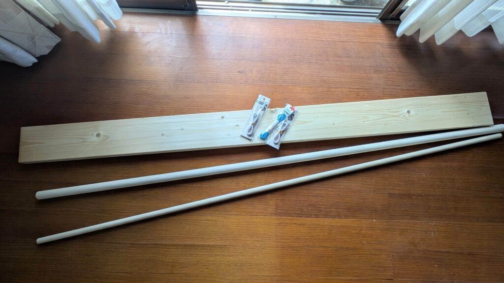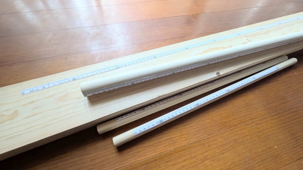 2×6材×1、φ30mmの丸棒×1、φ20mmの丸棒×1。長さはいずれも1800mm程度で、これだけあれば少し余るくらいです。