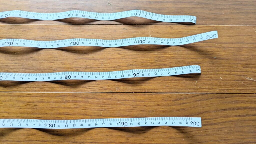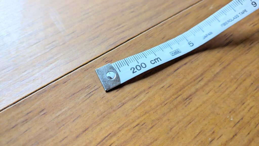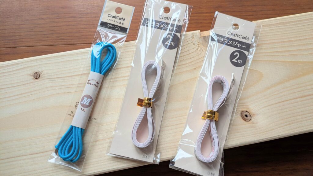 あとは1mのゴム紐×1と、2mメジャー×2(こだわりが強ければ1m×4本が理想)です。材料は以上でなんとかなります。いや、なんとかします。