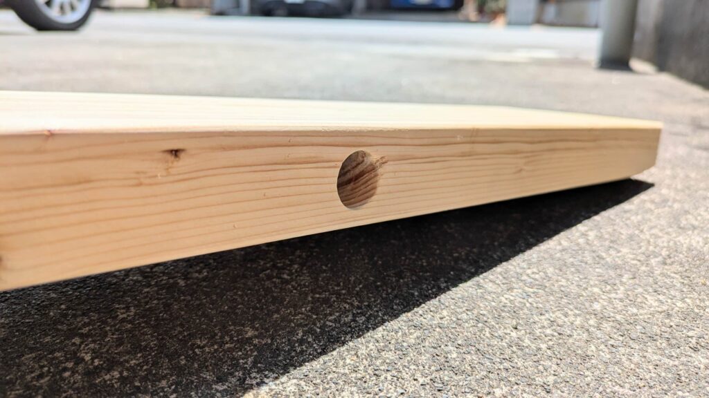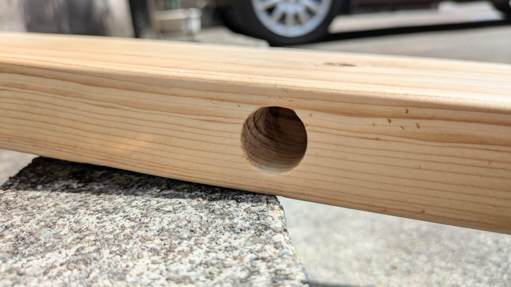 2×6材は片方の側面にφ20mm・深さ40mmの丸い穴をあけます。両端から320mmのところが円の中心になるように2カ所です。