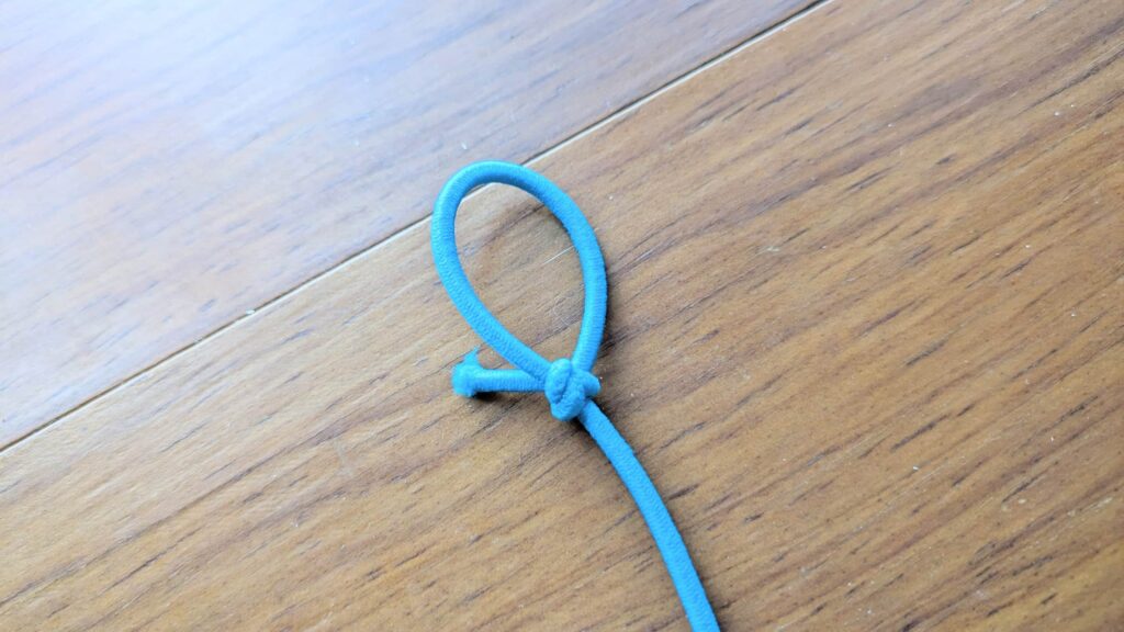 まずはゴム紐。こちらは両端に輪っかを作るだけです。輪を作ったところで、紐の長さが750mm程度になっていることが理想。